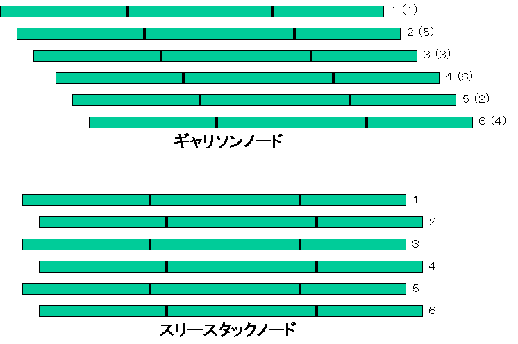 節のずらし方には、ギャリソンノードとスリースタックノードがあります。節と節の間隔は、ギャリソンノードの場合40〜50mm程度、