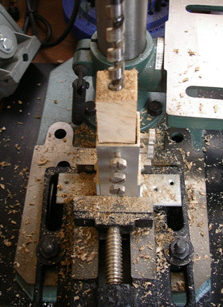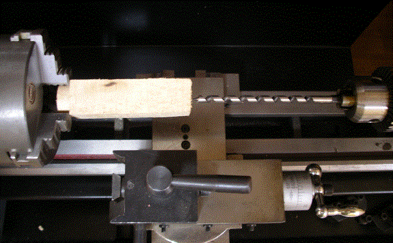 角材の丸くなった部分を旋盤のチャックでつかみ(写真右下)、8oの木工用ドリルで