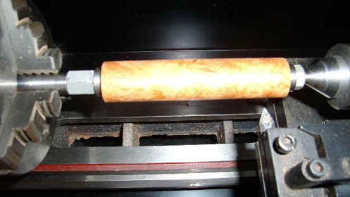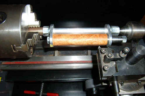 長ボルトと長ナットでフィラー固定用ジグを作成します。これで、角材を固定し旋盤のチャックで挟みます。
