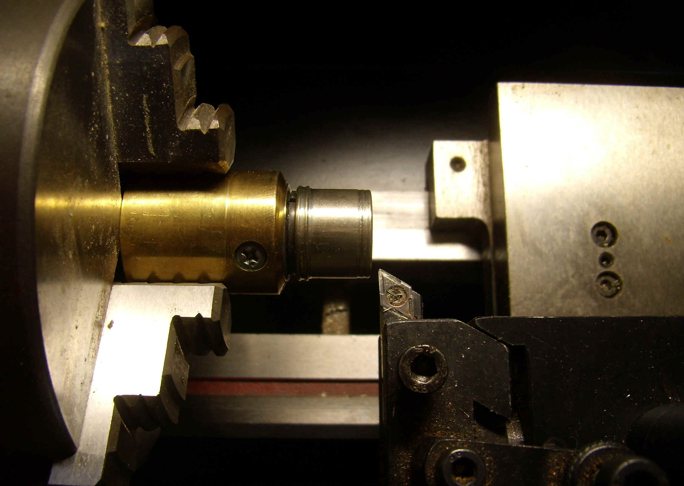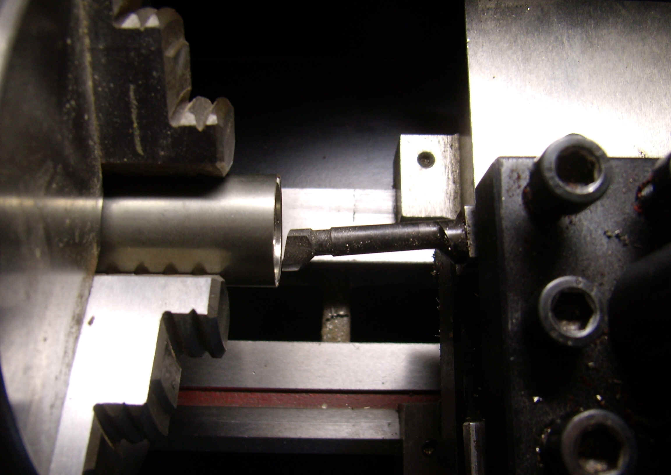 フィラーに合わせてキャップ&リングを制作します。 1. 直径20mmのニッケルシルバー棒を旋盤に設置し、右仕上げバイトで切断面を平らにします。 2.ドリルでの穴空け 3.穴ぐりバイトでリングの内径を17.3mmに仕上げる 4.リングの表面を仕上げる