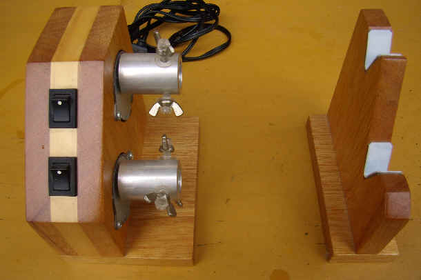 モーターは、10回転/分のギヤドモーターを使用しています。ブランクを固定する部分はφ25のアルミ棒にφ20の穴をあけ(モーターに取り付け側は、φ3)、蝶ネジ(三か所)はさむ様にしています。